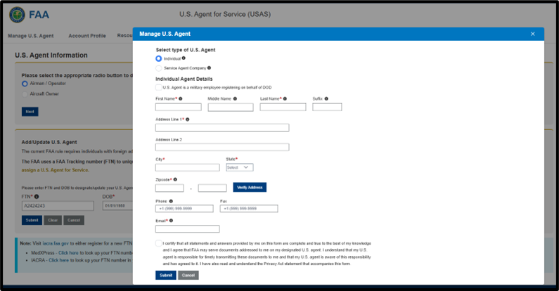 You are only required to designate a U.S. agent for service if you: • Do not have a U.S. physical address of record on file with the FAA; • Have a foreign address of record on file with the FAA; and • Hold or apply for a certificate, rating, or authorization under 14 CFR Part 47, 61, 63, 65, 67, or 107. You do not need to designate a U.S. agent if you have already updated your record of address with the FAA to provide a U.S. physical address. If you want to provide the FAA with a U.S. physical address, you may do so through the standard processes for Airmen or Aircraft Owners in lieu of designating a U.S. agent for service. Please be aware that a U.S. physical address is an address in the States of the United States, the District of Columbia, or any U.S. territory or possession, but excludes post office boxes, military post office boxes, mail drop boxes, and commercial addresses that are not also residential addresses.